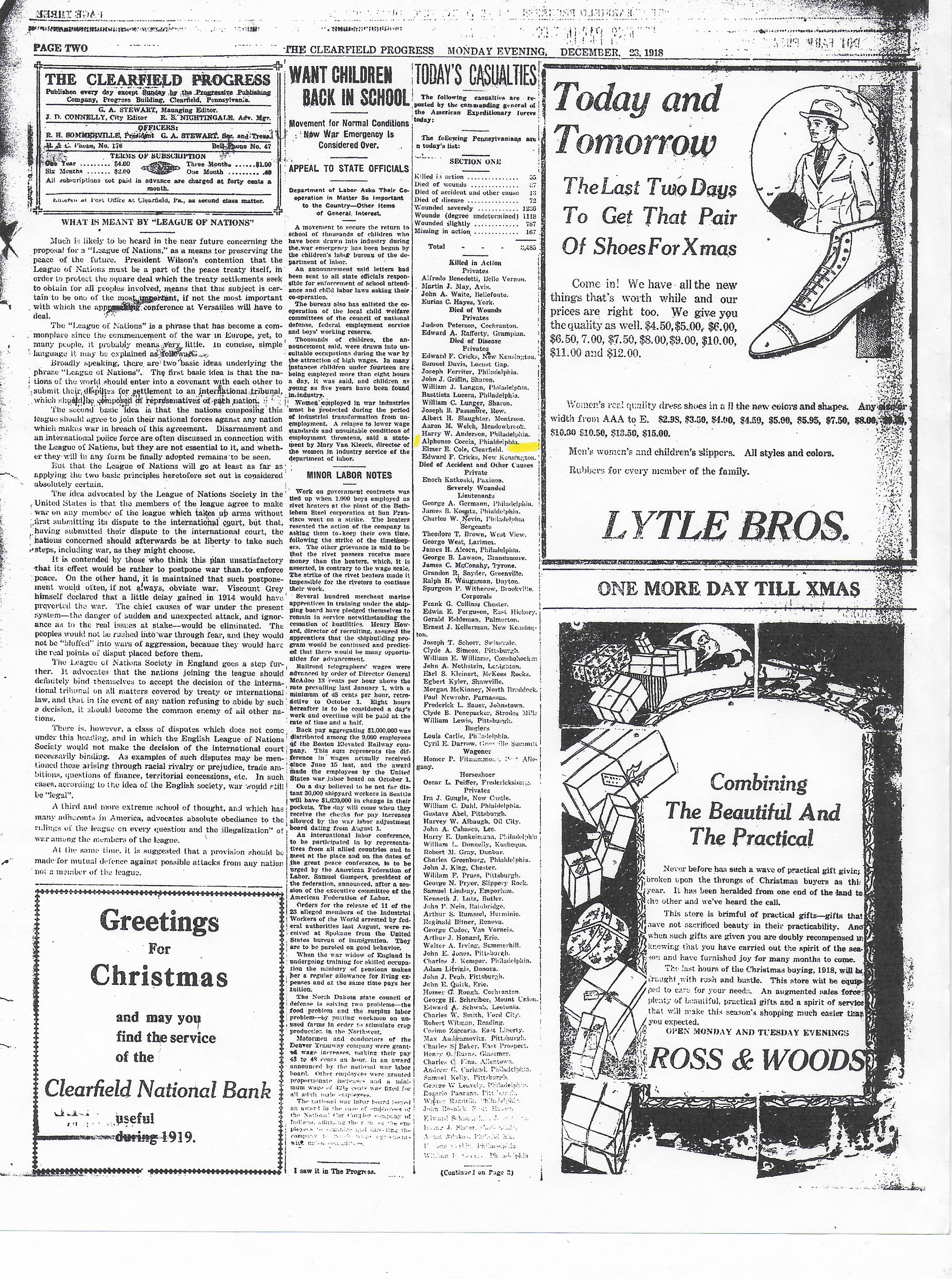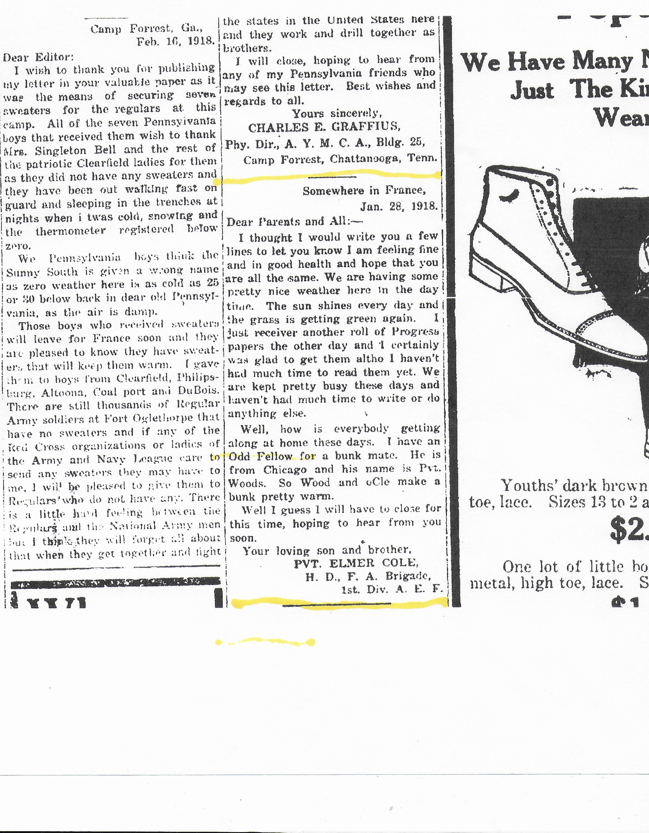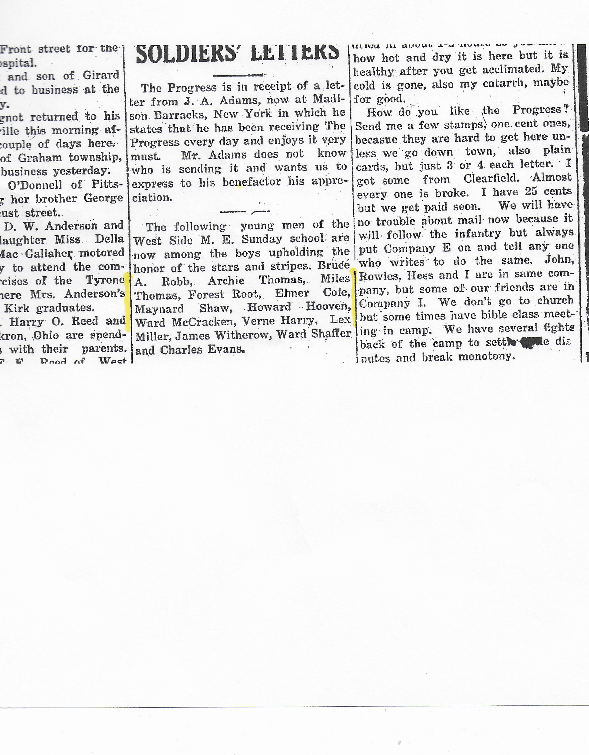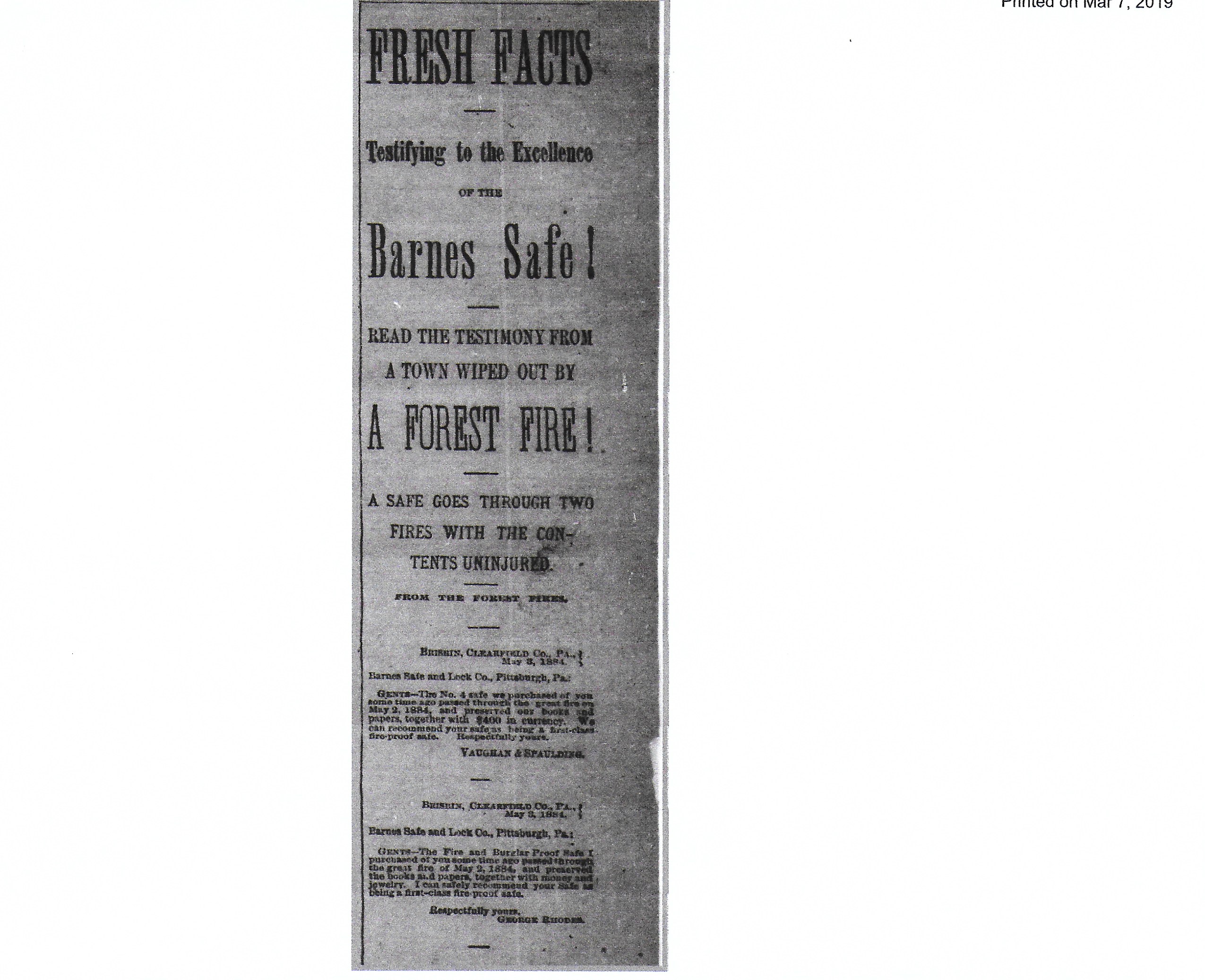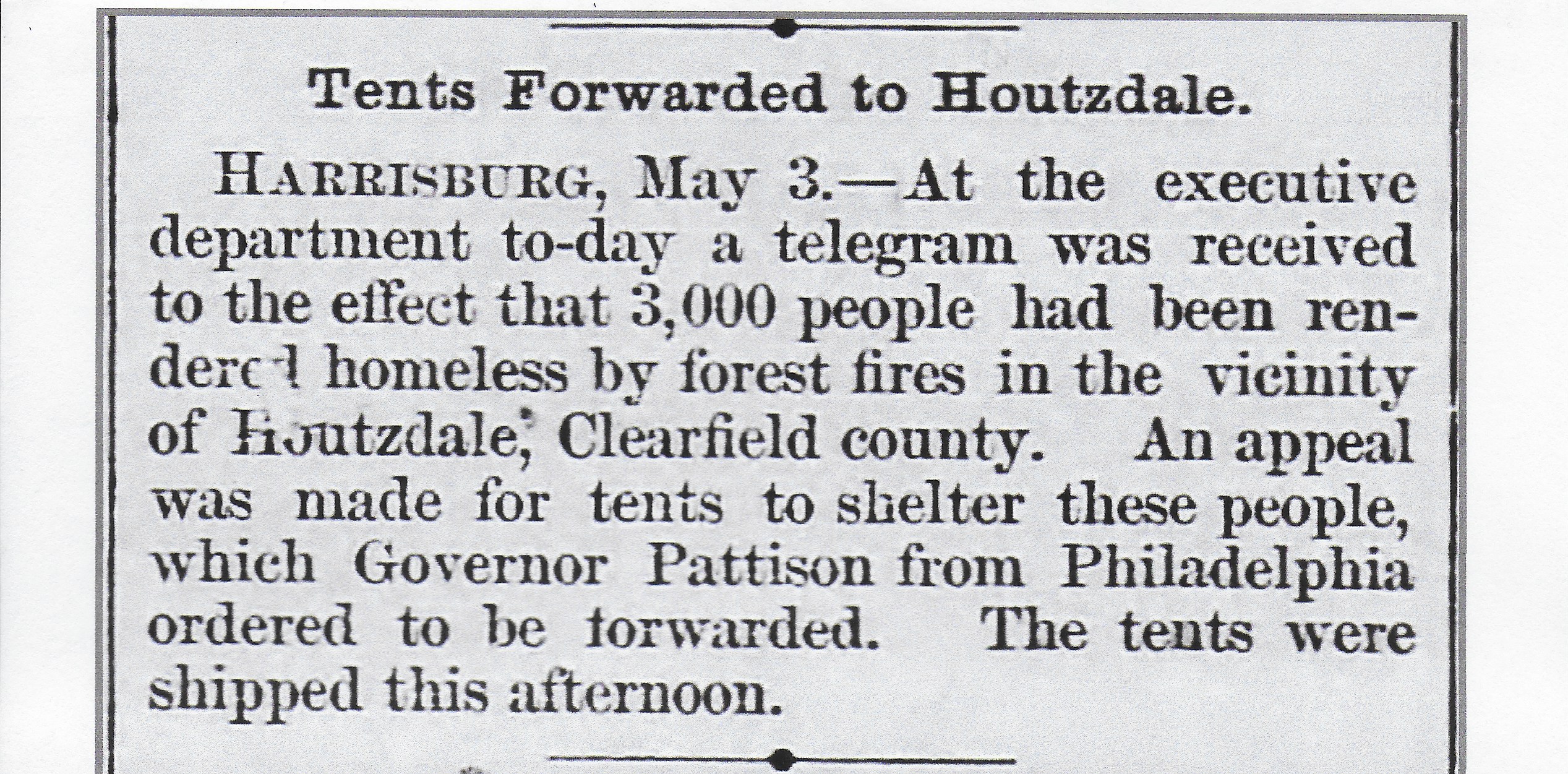 The Raftmens Journal, Clearfield, Pa. Wednesday, May 14, 1884 Houtzdale After the Fire- other News and Gossip The Opera House will be rebuilt. Sight-seers still frequent the streets of Brisbin. The new freight office is about ready for business. Burket Bro’s are pushing work on their new bakery. Relief is still coming in, and more is still needed. Lumber piles are visible in all directions in Brisbin. Portions of the sidewalks remain uninjured, here and there. Services are now held regularly in the new P.E. chapel. It is now quite evident that the burnt district will be rebuilt. Most of the societies have secured meeting places in Houtzdale. R.S. Isaberg is ready to commence rebuilding his hardware store. J.M. Lehman, Esq., dispenses law from the cavernous recesses of two army tents. The principal drawback just now in Brisbin is the difficulty in procuring lumber. Shell Bro’s dances at their platform have become one of the institutions of the town. The provisions received at this place by the relief committee deserve special mention for their superior excellence. Moore & VanDusen had their first load of lumber on the ground, to rebuild their ice house, before 6 p.m., in the day of the fire. It may sound somewhat egotistical on our part to record it, but it is generally conceded that the Journal’s account of the fire was the most complete and reliable which reached here. Judging from the preparations made for rebuilding, Brisbinites have lost none of their old-time energy. On the contrary, it appears to have been increased by their misfortunes. Nothing like grit, gentlemen. It will win every time. A stroll through the ruins of Brisbin Sunday revealed the fact that at that time about 25 temporary abodes had been erected or were in course of erection, and the indications are that their number will be almost, if not altogether trebled by the time this is in print. Now that Brisbin’s one-story school houses have gone up in smoke, it is hoped that the directors will erect a good, substantial and commodious building sufficient to accommodate all the schools in the borough under one roof. It will be more satisfactory in every way, besides being much cheaper than the plan which has hitherto been pursued, of building one room school houses and placing them in all parts of town. Postmaster Vaughn sits contentedly in an old wagon makers shop, surrounded by portions of wagons, buggies, sleds, sleighs, cooking utensils, old boots and other litter, with his letter boxes supported at one end by a workbench, and the other end resting od a dilapidated table, considerably the worse of fire. His stock in trade consists of seven lead pencils, nineteen sheets of paper, and a portion of a box of cigars. An internal revenue license adorns the wall in the rear of his establishment.