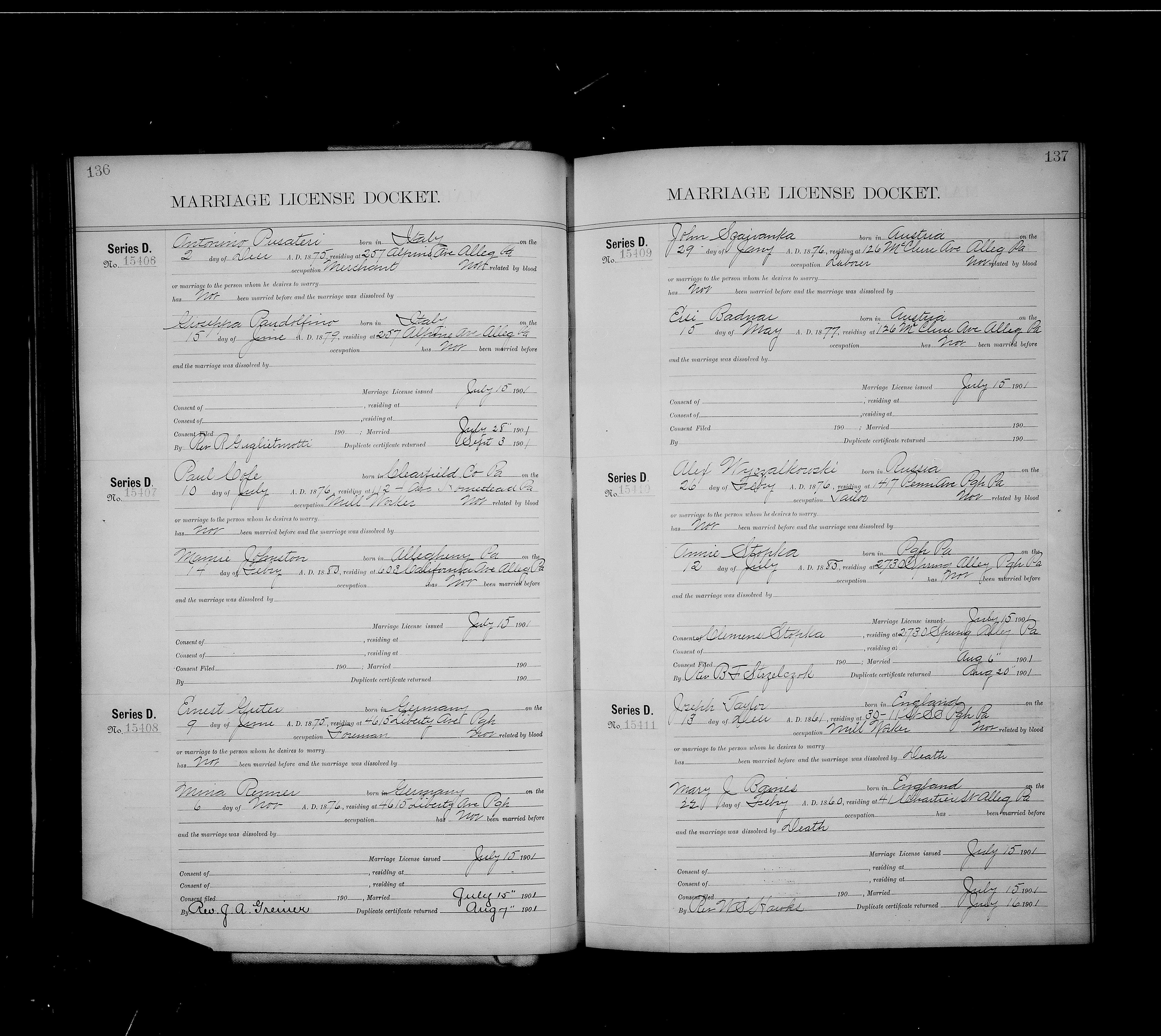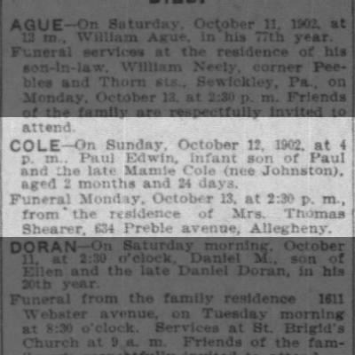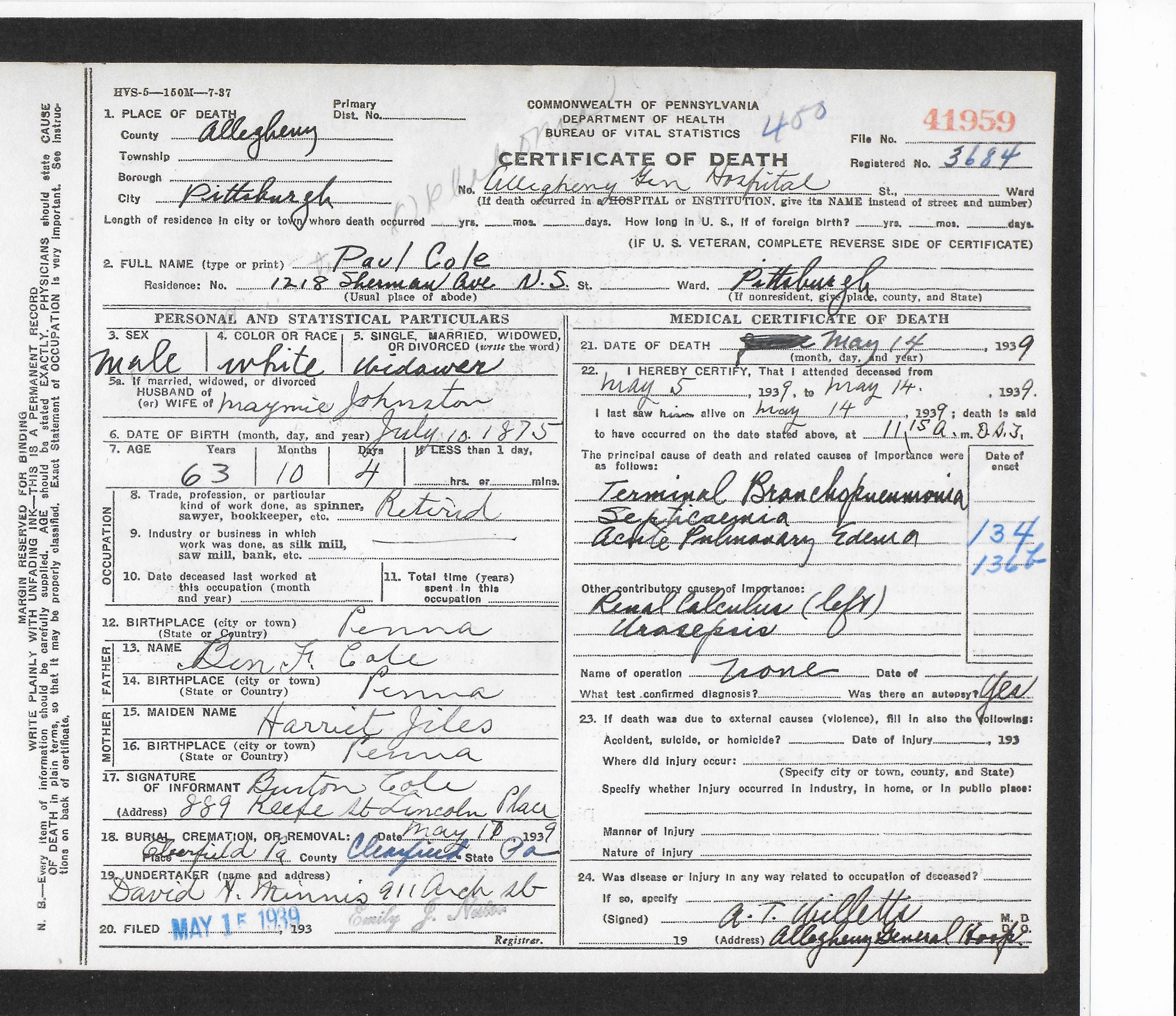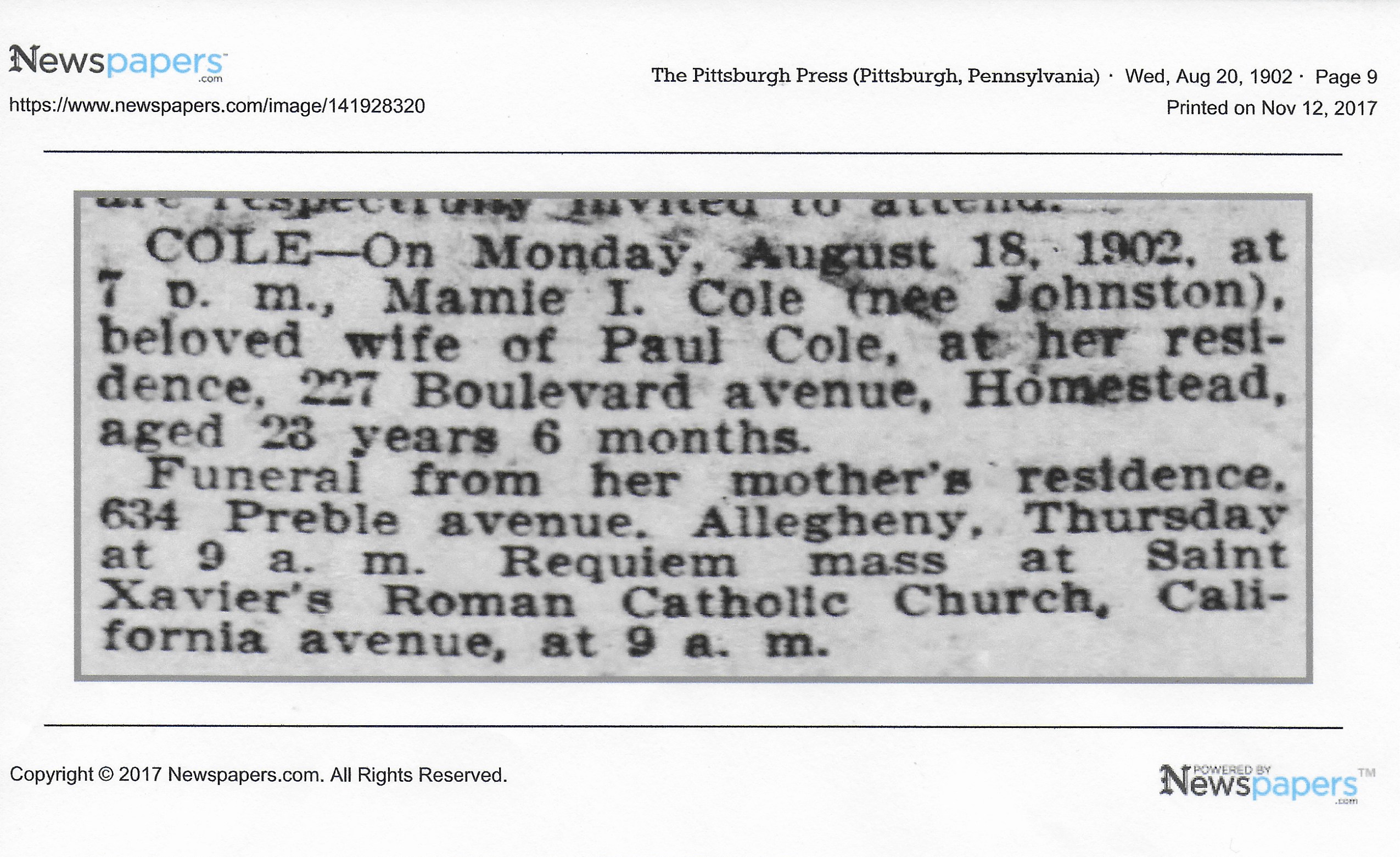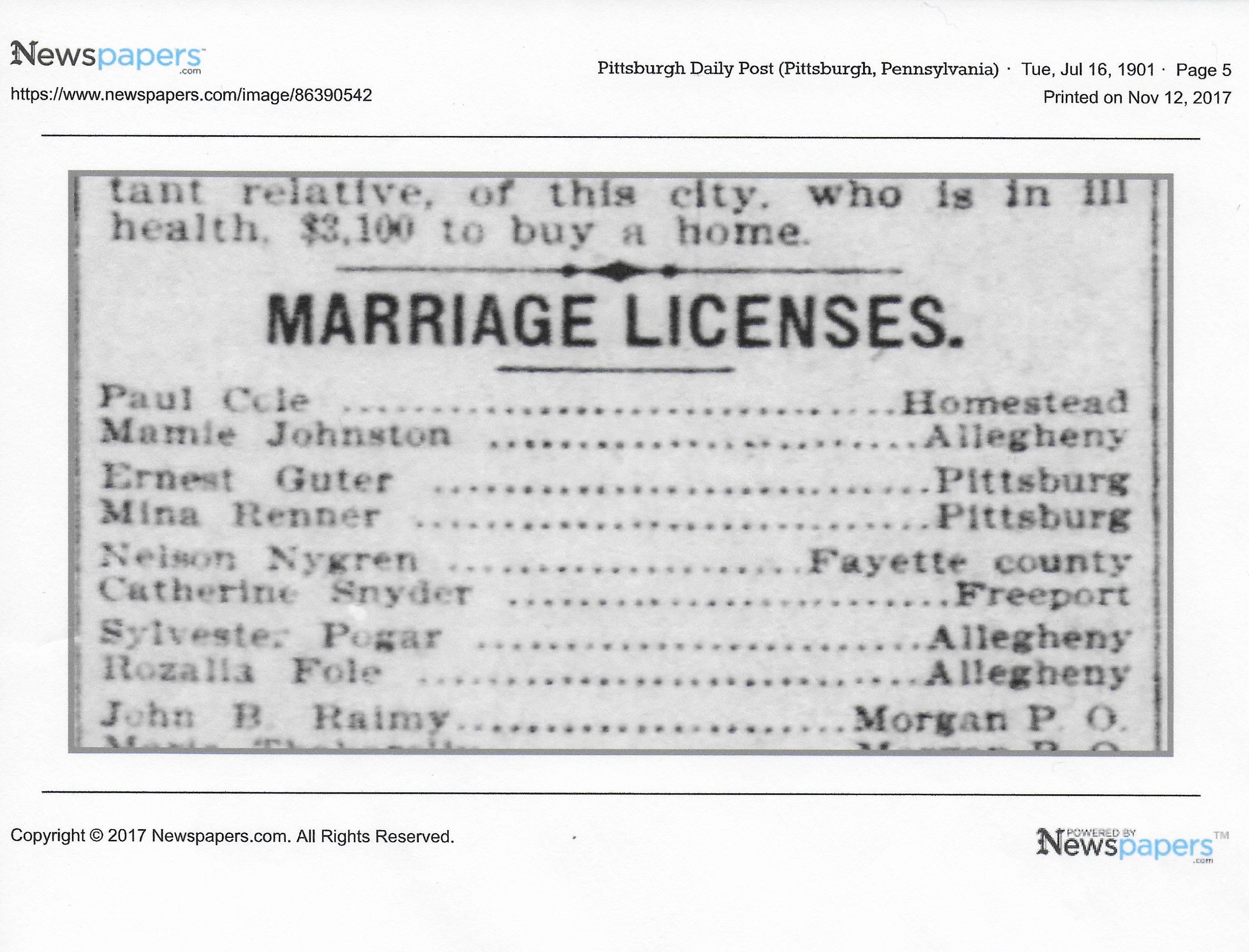 Hiram and Elizabeth Wilkins youngest child was born in Brisbin in 1890 but then they moved to Patton in Cambria County. There, my great grandmother, Eliza met, and on March 14, 1894 married Benjamin Franklin Cole Jr.