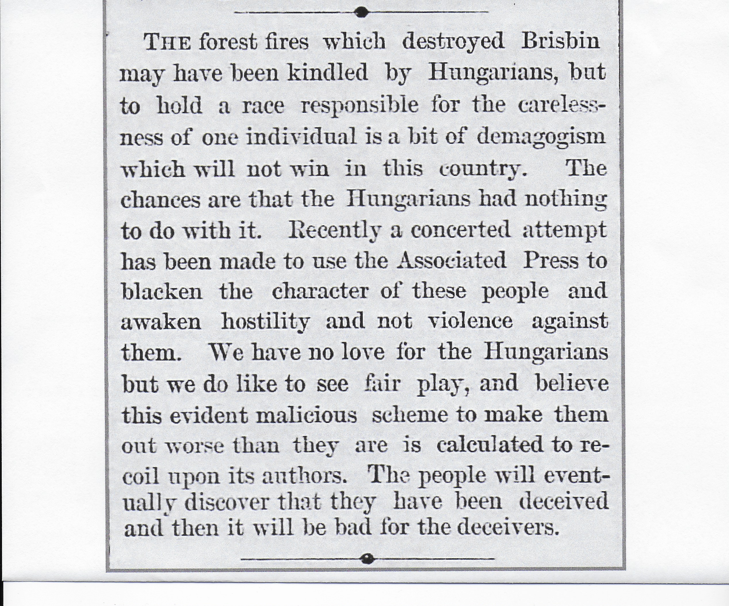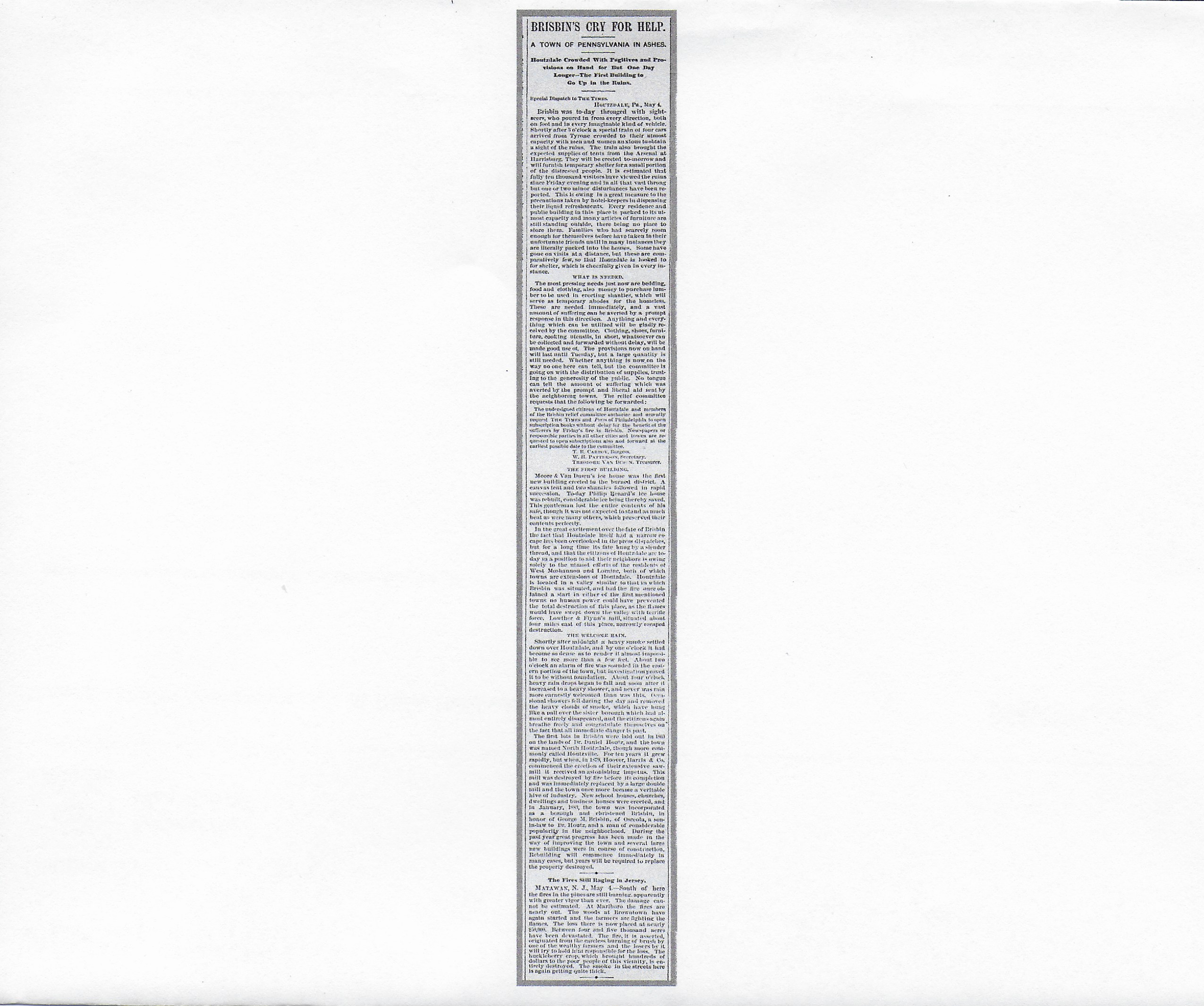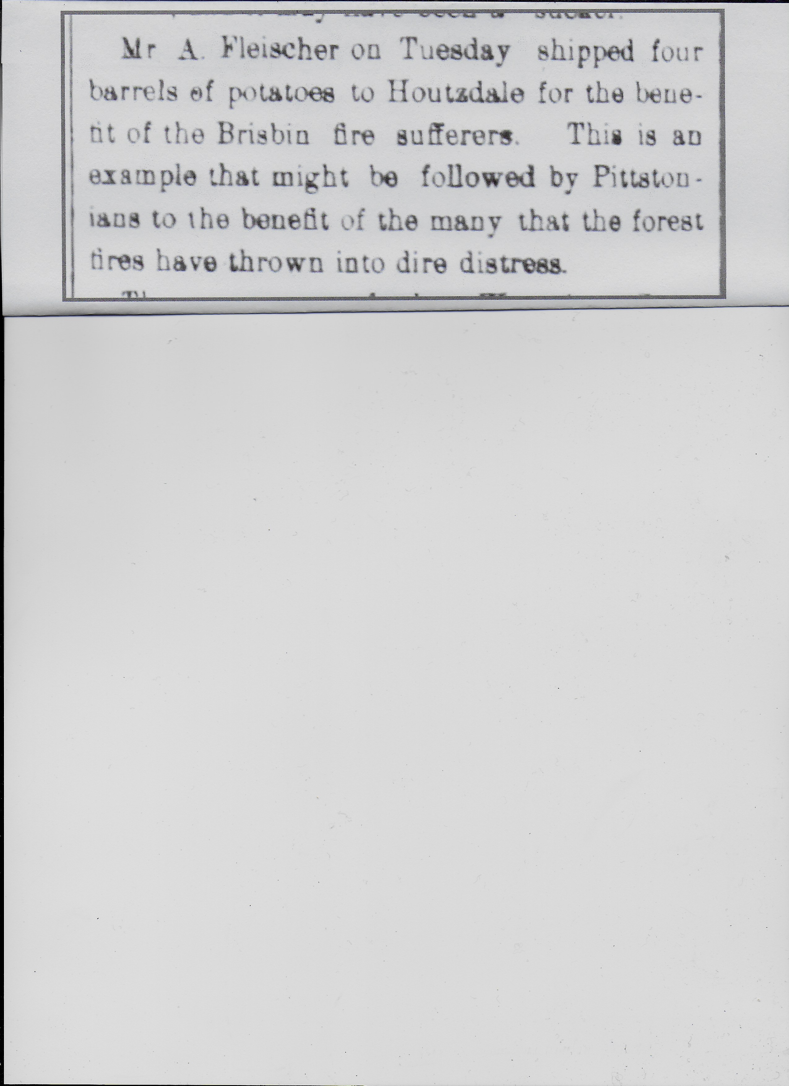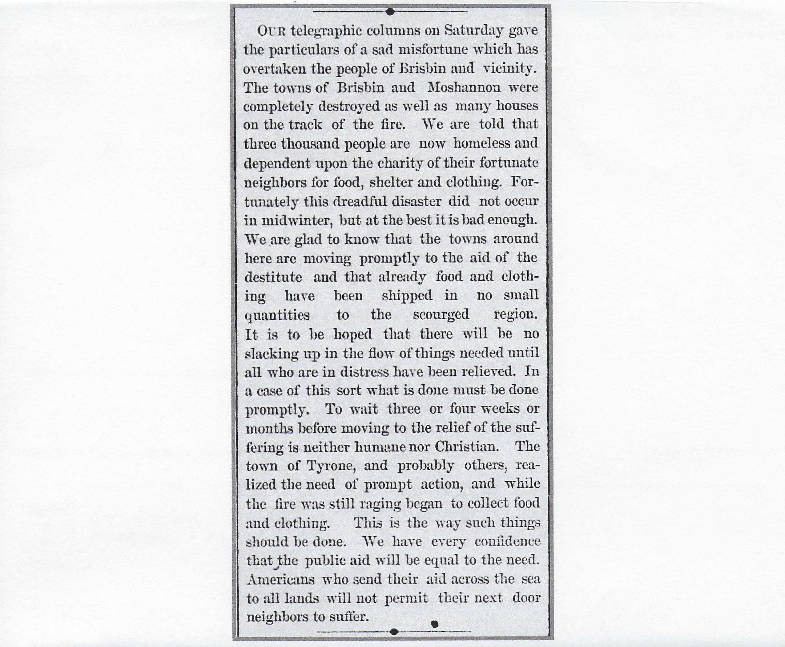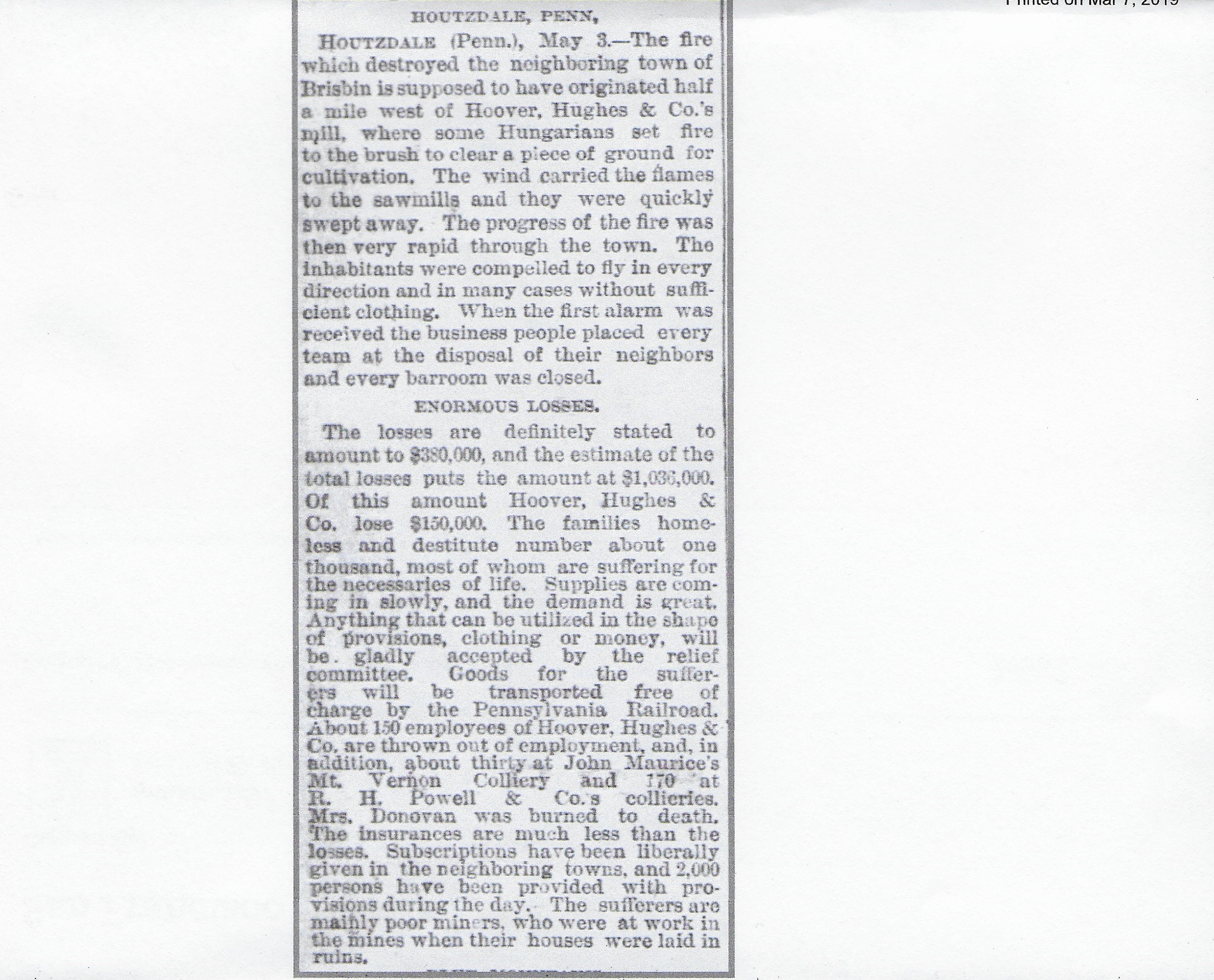 One of the best articles about the fire was in the Raftmens Journal, Clearfield, Pa., on Wednesday, May 7, 1884. I have a copy of the article from microfilm and it’s very difficult to read. I couldn’t find the article on the internet to get a clear copy so, with a bit of editing, I’m typing out the article. BRISBIN BURNED Almost the Entire Town Swept Away by the Flames 500 Buildings Destroyed- Hundreds of Families Homeless A Generous Public Called Upon for Food, Clothing, and Lumber Twice in the history of Clearfield County has she lost an entire town by fire and both times the southwestern corner of the county has been the sufferer. On Thursday, May 20, 1875, fires were burning in the woods surrounding the town of Osceola, started as usual in some unknown way….Phoenix-like it arose from the ashes, and one unacquainted with the facts would not suppose that such a fate had so recently befallen the now flourishing town of Osceola. On Friday morning last the people of Brisbin, but eight miles from Osceola, were warned that fires had been started in the woods and that they were being swept toward the town by high wind which was then blowing, but before they could fully realize their danger the work of destruction had begun, and before night-fall it was complete. With the exception of a few buildings scattered over the hills on the outskirts of the village, it is a blackened ruin. Five hundred or more buildings have been burned and between two and three thousand people are homeless and in want. The greater number are being sheltered by the people of Houtzdale, which is separated from Brisbin by a high hill, the distance between the two towns being about one mile. So promptly was the aid extended that provisions from this and other places furnished breakfast for the sufferers on Saturday morning. For weeks they will necessarily be dependent upon the public for food and raiment, and they are also in immediate want of money, lumber, etc., in order that they may build temporary houses. The Keystone state will not let them suffer unnecessarily. From our Man on the Ground Houtzdale, Pa., May 2, 1884 It is utterly impossible to give a correct idea of the state of affairs in what was but a few hours since the bustling, thriving town of Brisbin. The fire fiend has done his work well, and hundreds are tonight homeless and penniless who were this morning in possession of comfortable homes, happy families and abundance of the world’s goods to meet all present wants. All is now misery, desolation, want, and in many cases, despair. Many families who became separated during the excitement are still vainly searching for each other, and the search will probably have to be kept up for several days yet before all are finally united. The fire which was the immediate cause of the destruction of our sister borough, originated at a point about 1 1/2 miles west of Brisbin, where a number of Hungarians had purchased a patch of ground, and, disregarding all warnings, started fires in the brush for the purpose of clearing it off. The woods being dry as tinder, with a perfect gale blowing in the direction of the fated town, it was but a short time until the citizens became alarmed, and shortly after 12 o’clock the whistles of Hoover, Hughes, & Co’s mills sounded the alarm, which was promptly responded to. Every business house and bar-room in Houtzdale was promptly closed, and all hurried over the hill to render what assistance was possible. The main object was to save the mills, for if they caught fire all hope was gone, and hence a desperate battle was fought. But man’s strength availed little against which they manfully but hopelessly strove. Never have I seen a man work harder nor display more heroism than did Mr. T. C. Cryan, engineer of the mill, in his efforts to save the property of his employers. He will have the marks of the fray for some time to come, having been badly scorched about the face and hands. Once the flames gained a foothold in the mills, all hope of saving the town was abandoned, and all energies were devoted to carrying out and burying, or otherwise disposing of whatever could be seized in a hurry. Teams flocked in, and every one worked with a will, but comparatively little was saved, owing to the brief time which elapsed before the flames were sweeping everything before them. Four hours after the alarm was sounded, it was possible to walk through the ruins without serious inconvenience from smoke or fire…. So far as is positively known as of this writing (Friday night), but one life has been lost, the victim being an aged lady named Donovan, who perished in the flames, and was with great difficulty identified. Some of those yet missing may have perished, as there are numbers of whom no trace can be found. A great many persons are utterly prostrated by the fatigue and excitement of the day, some of whom can scarcely be expected to recover. There is little doubt that the greater portion of the town will be rebuilt as rapidly as possible. Geo. Rhodes, of the Seven Stars hotel, had his order for lumber and building materials placed before the ruins of his former establishment were half consumed. L. & J. Simendinger have also placed their orders, and before this goes to press, the work of rebuilding will have commenced. Many others will do likewise during the next few days, and within a week the music of hammer and saw will reverberate throughout the now desolate valley. Many of those who own lots are anxious to build shanties which will serve as temporary abodes until more suitable dwellings can be erected, but at present they are entirely destitute. In order to afford these unfortunates at least temporary relief, contributions of lumber are asked for, it is hoped that the appeal will be responded to immediately, as the need is urgent. Houtzdale, May 5, 1884 The greater portion of Friday night was spent in the ruins with a friend who had saved a few of his effects and not having ha