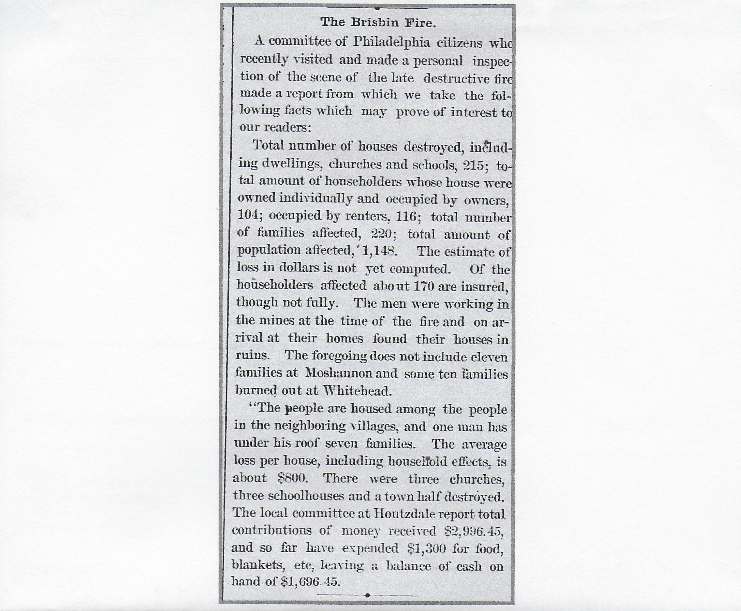 Houtzdale Observer newspaper January 8, 1885 Brisbin today is ahead of the Brisbin which on the evening of the third of May had been reduced to ashes with better buildings, with new energies called forth by disaster. Her citizens are more self-reliant and stronger. And while the fire was a terrible loss in may ways, it showed forth the highest and best attributes of the citizens of both boroughs.